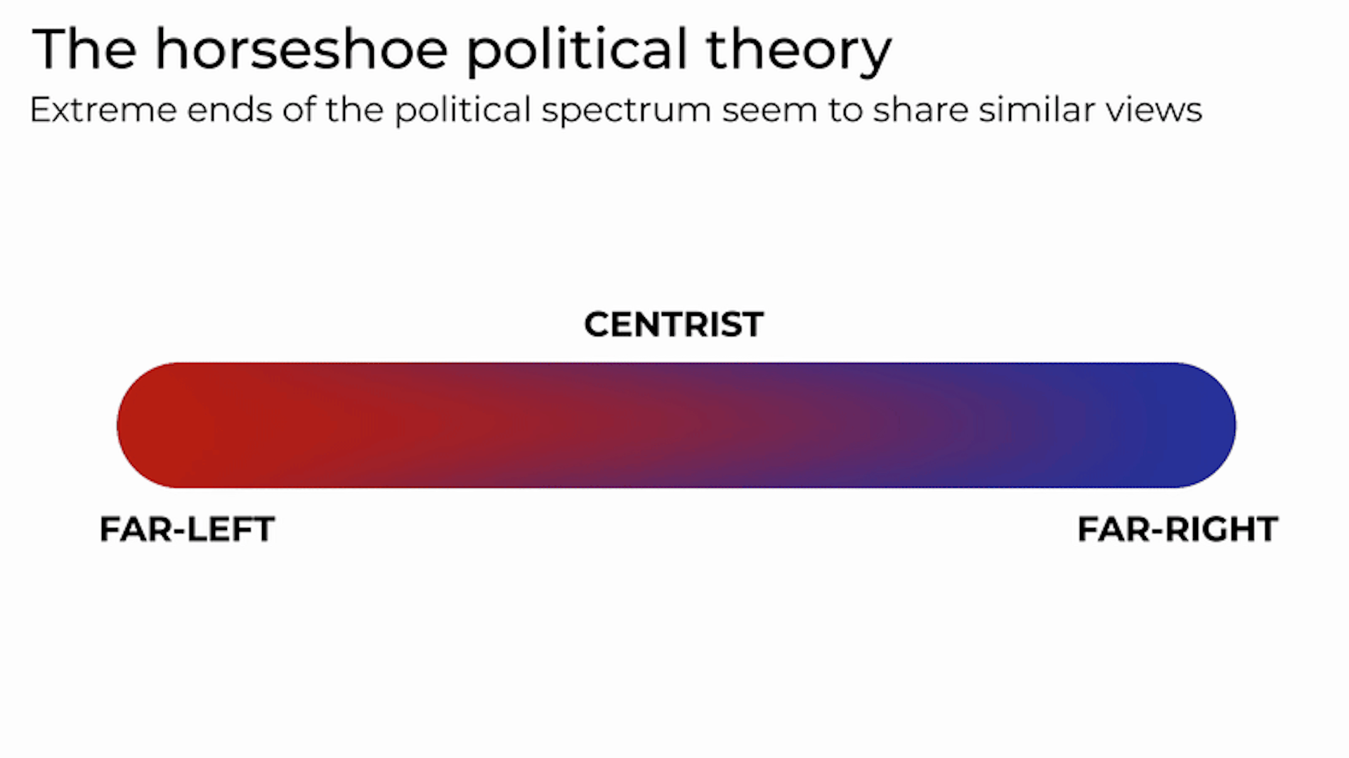 This posits that the far-left and far-right are closer to each other than to the political centre. The theory takes the political spectrum and curves it into a horseshoe, with the middle of the shoe’s curve representing centrist (or “moderate”) values.